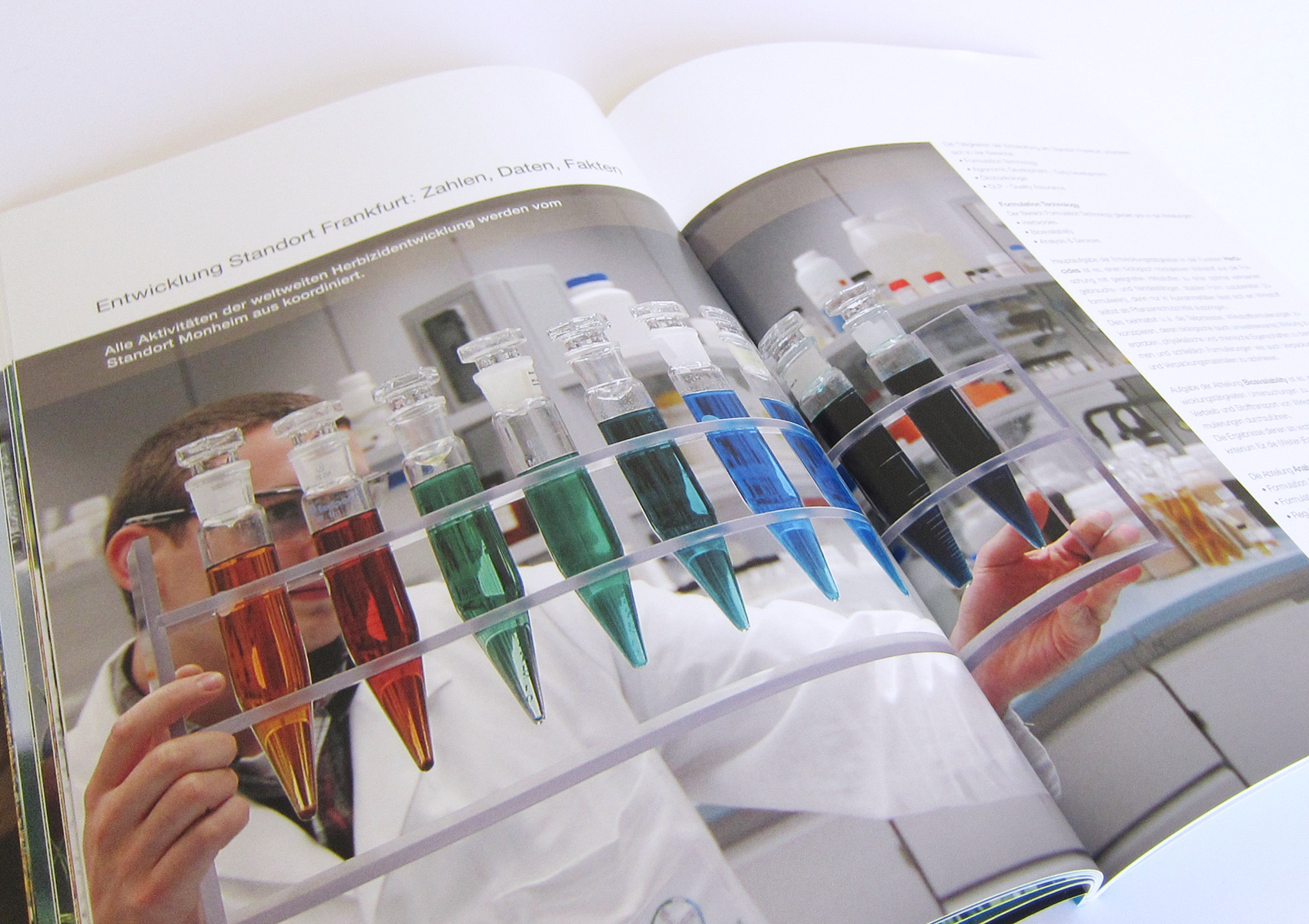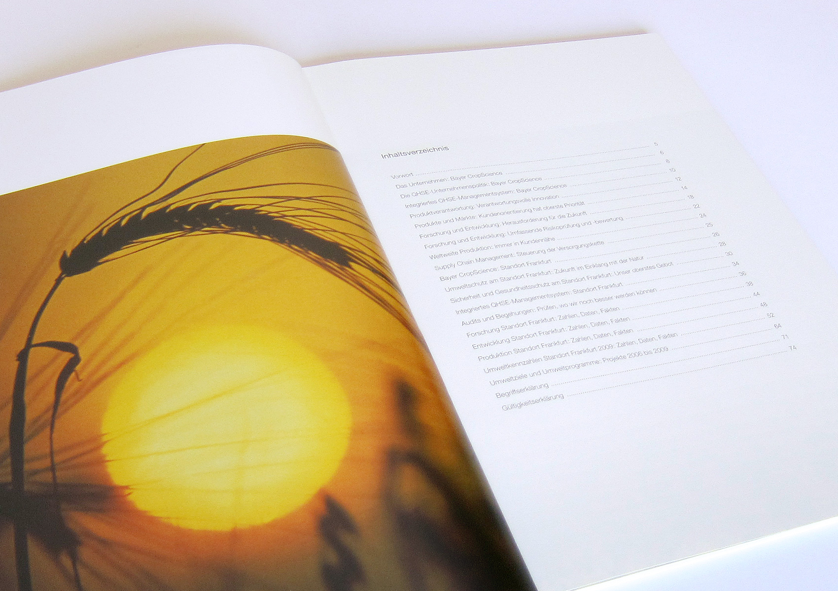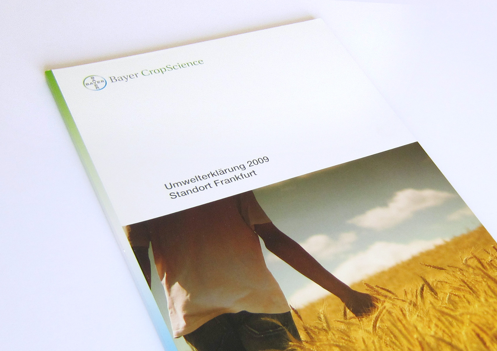 Für die jährlich erscheinende, knapp 80 Seiten starke Umwelterkärung von Bayer Crop Science für den Standort Frankfurt wurden das Layout und das Bildkonzept völlig neu konzipiert und umgesetzt.