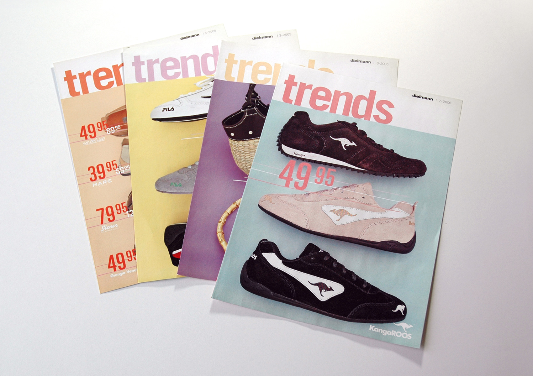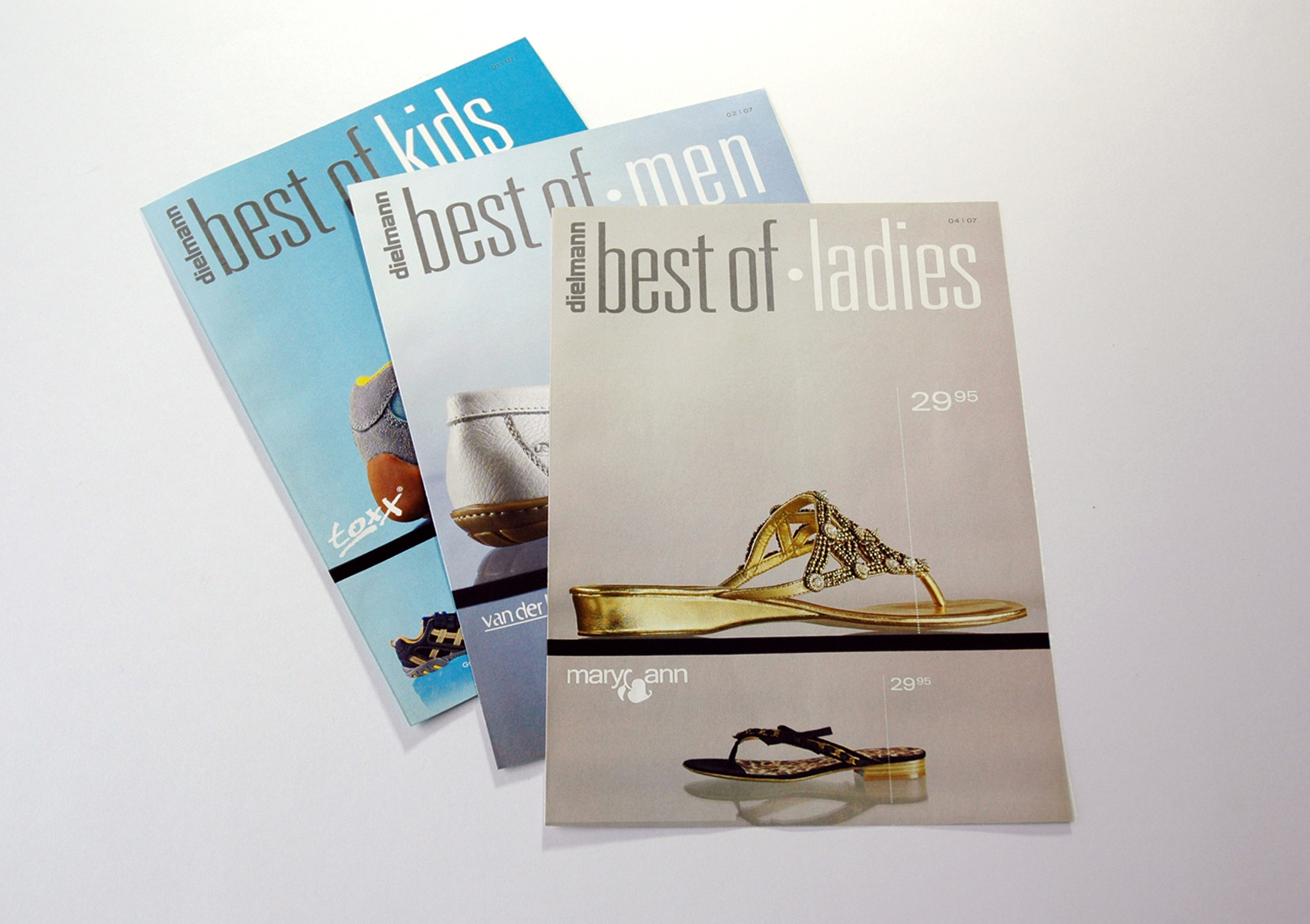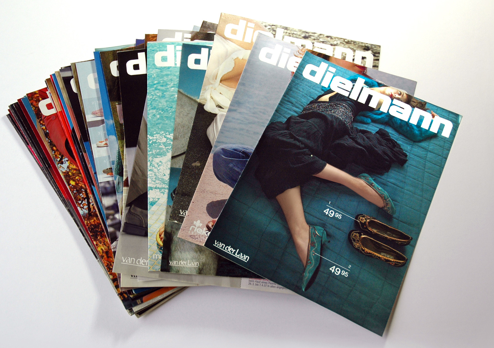 Die Zeitungsbeileger des Schuhhaus Dielmann sind mehr Modejournal als Verkaufsprospekt. Und sie sind ein gutes Beispiel für eine Komplettbetreuung – vom Konzept über die gestalterische Umsetzung und Fotoshootings bis hin zur Produktion. Das gilt übrigens auch für alle anderen Print-Medien des Unternehmens bis hin zur Shop-Ausstattung und Dekoration.