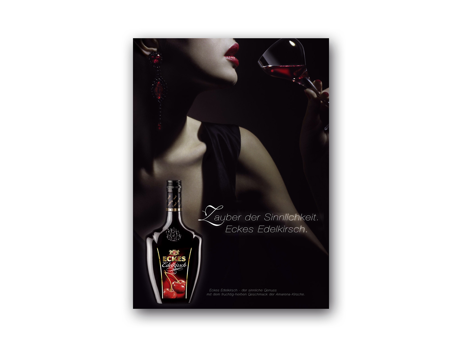 Der Relaunch der Traditionsmarke Eckes Edelkirsch sollte das Produkt verjüngen und seinen Genuss als sinnliches Erlebnis darstellen. Ziegruppe waren in erster Linie Frauen. Auf dieser Basis wurde das Anzeigen- und Plakatmotiv konzipiert und mit den Mitteln der Modefotografie und Postproduktion umgesetzt.