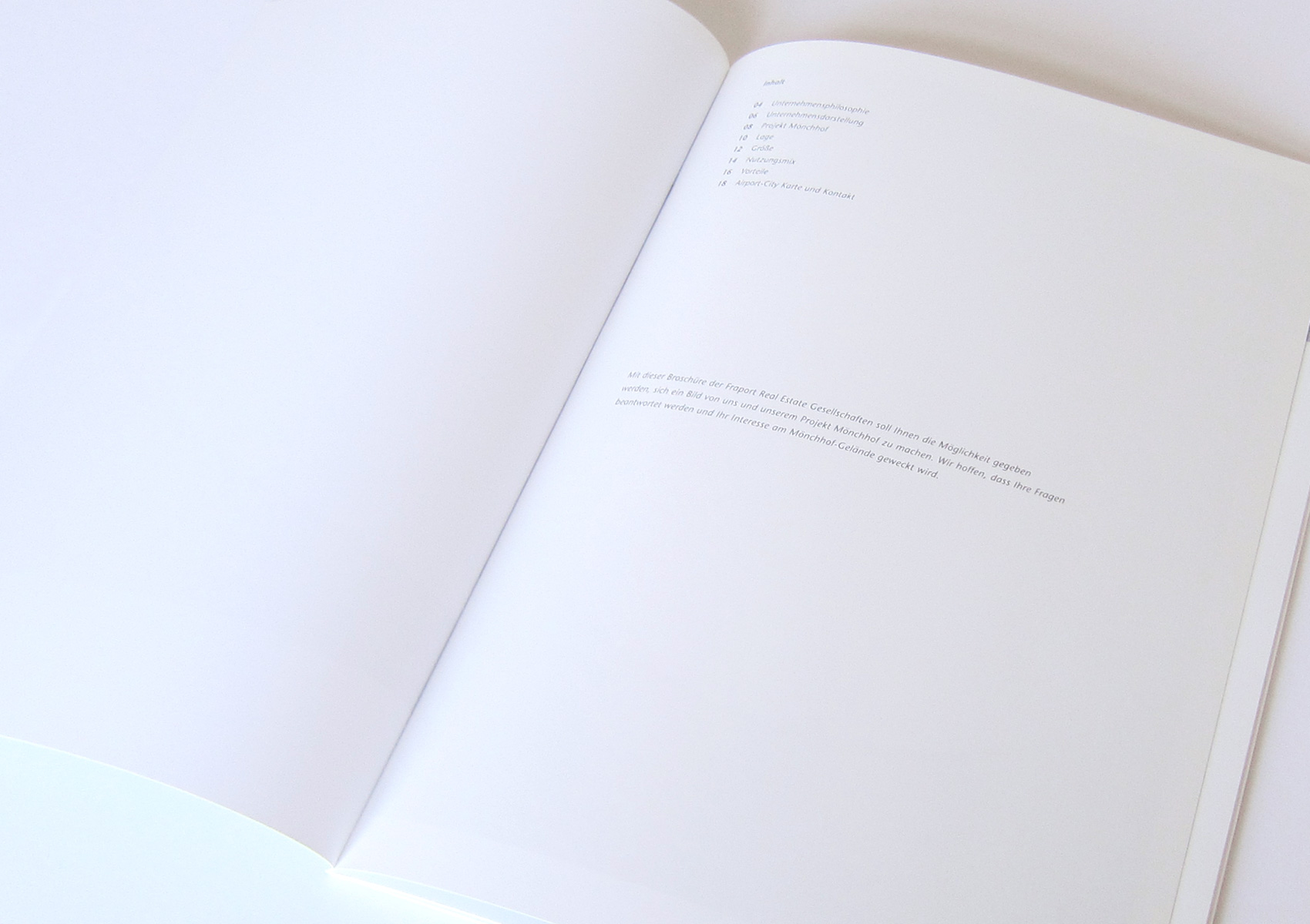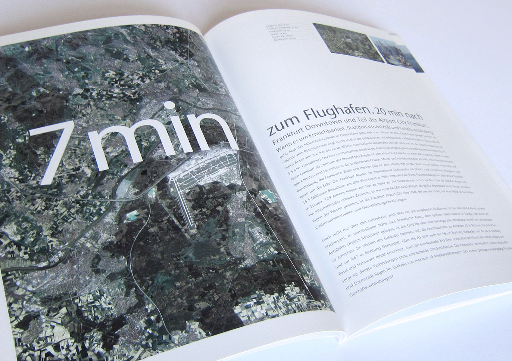 Aufgabe dieser Broschüre war die Vermarktung des Standortes “Mönchhofgelände” unweit des Frankfurter Rhein-Main-Flughafens. Ihre Besonderheit: ein aufmerksamkeitsstarkes Layout sowie ein für den Bereich Standortmarketing ungewöhnliches Bildonzept.