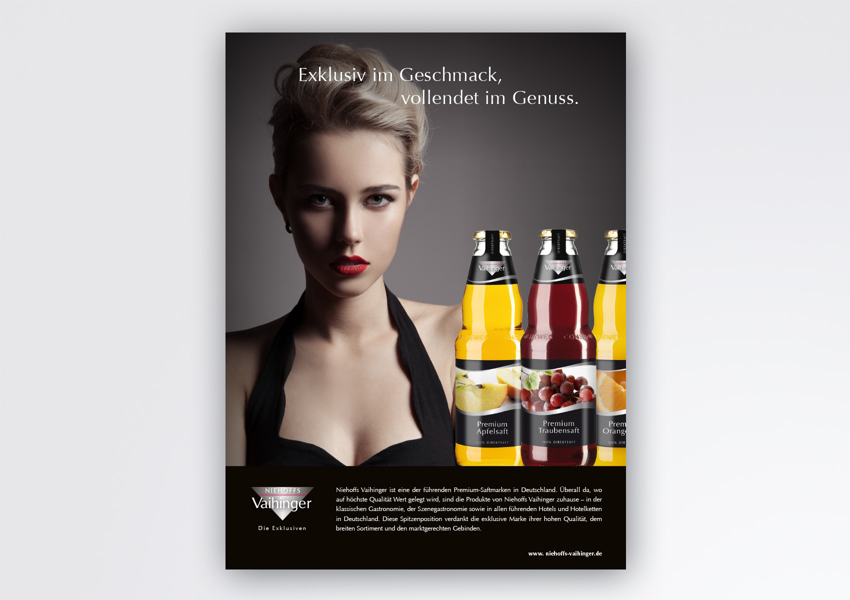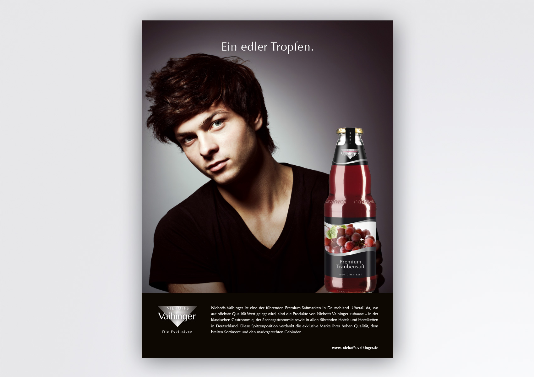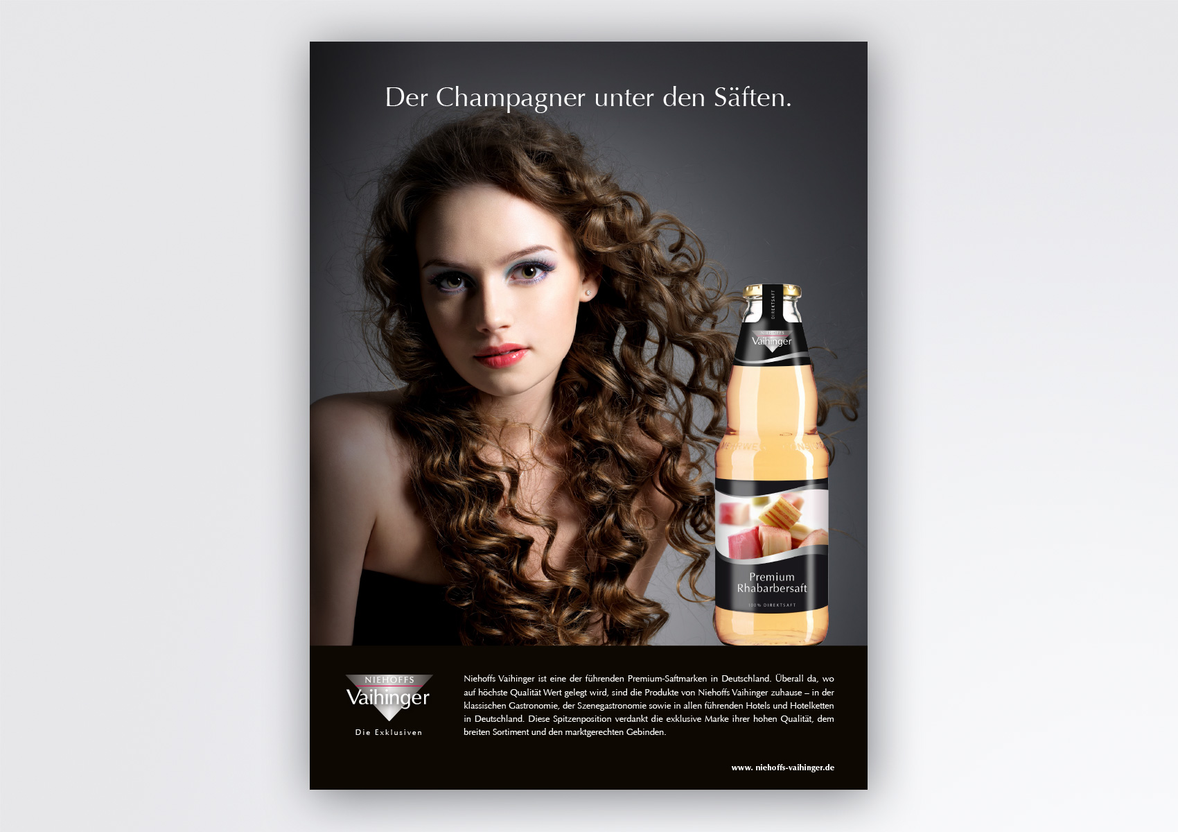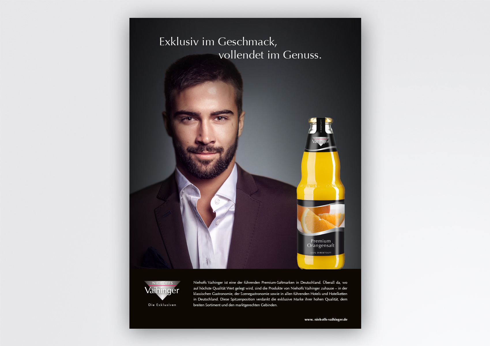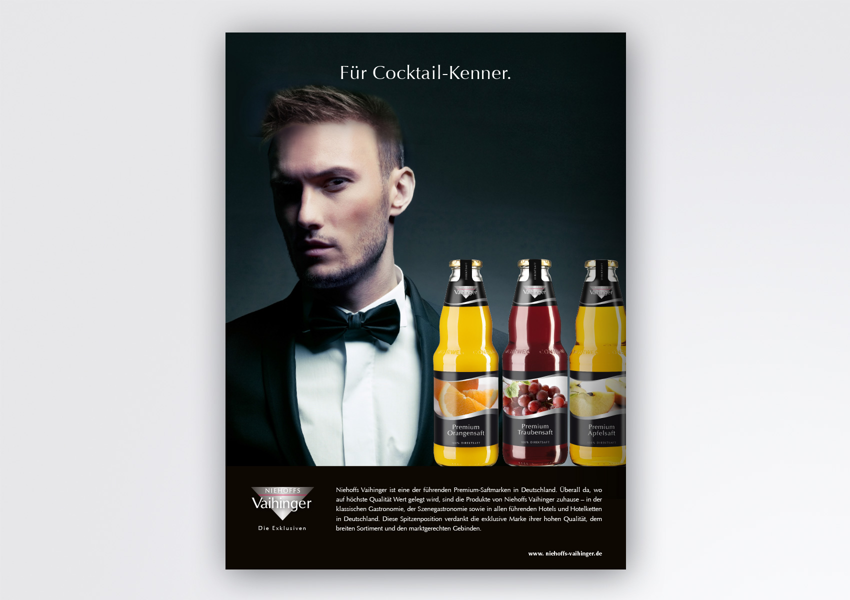 Diese für den Marken-Relaunch von Niehoffs Vaihinger konzipierten Anzeigen- und Plakatmotive vermitteln den Premium-Anspruch der Marke. Oder kurz gesagt: Hochwertige Fruchtsäfte, hochwertiges Design.