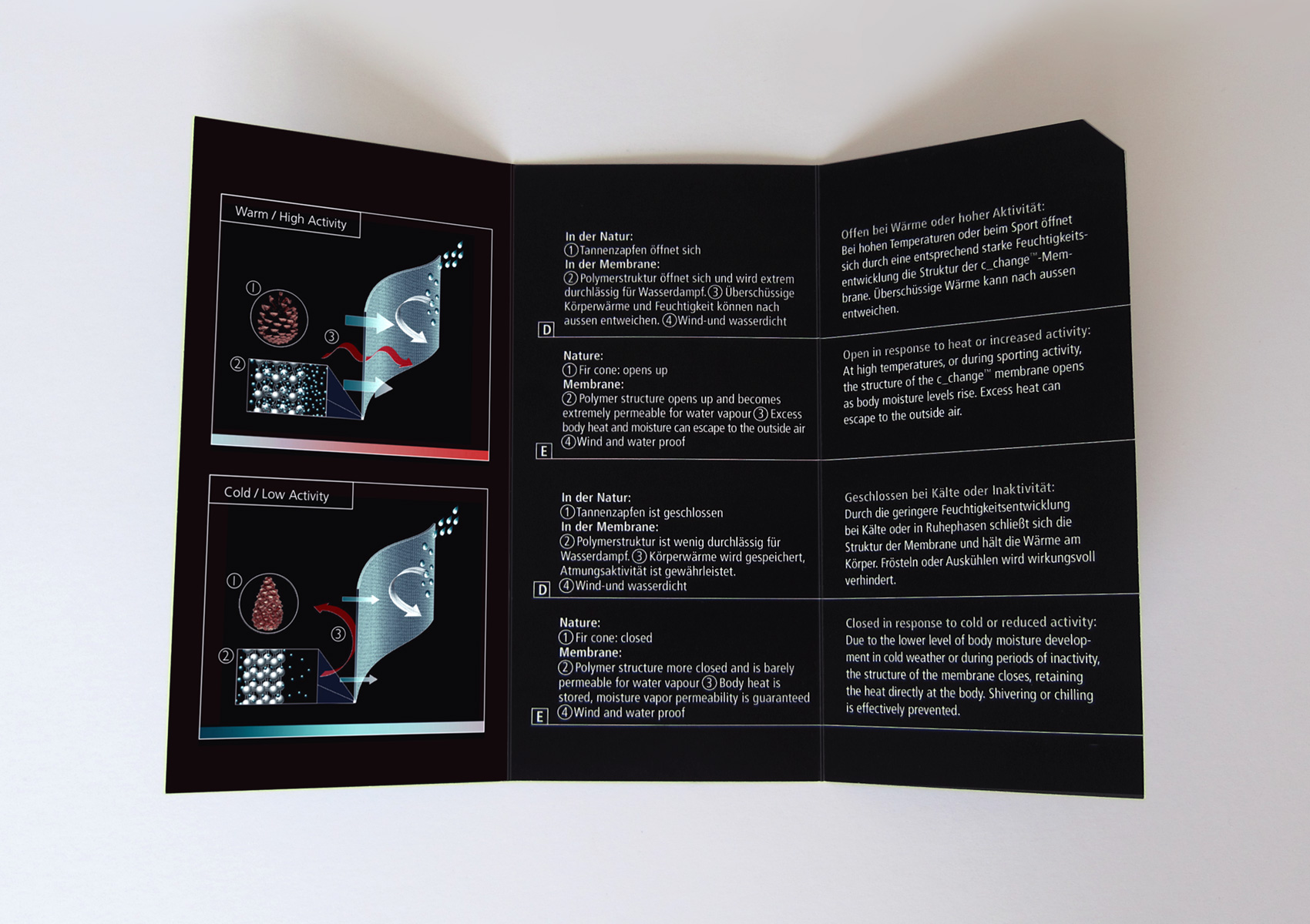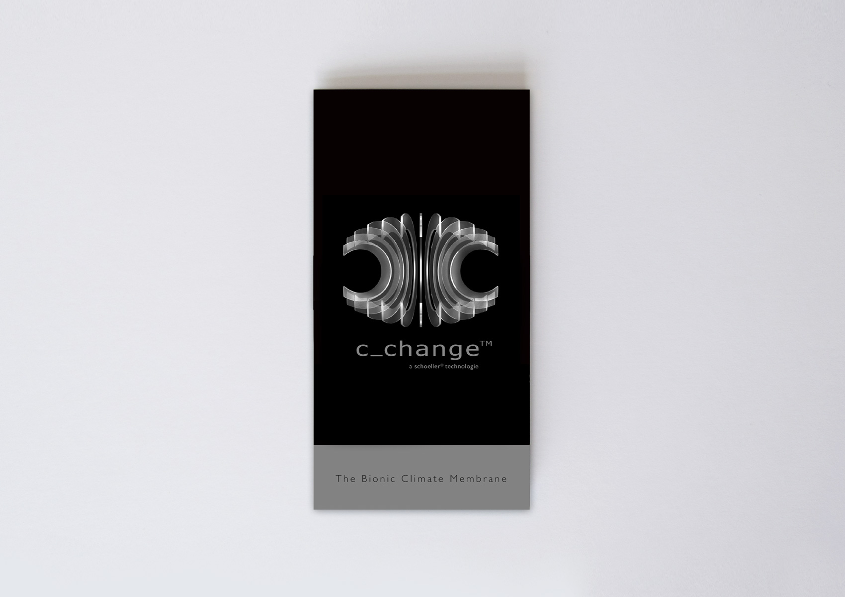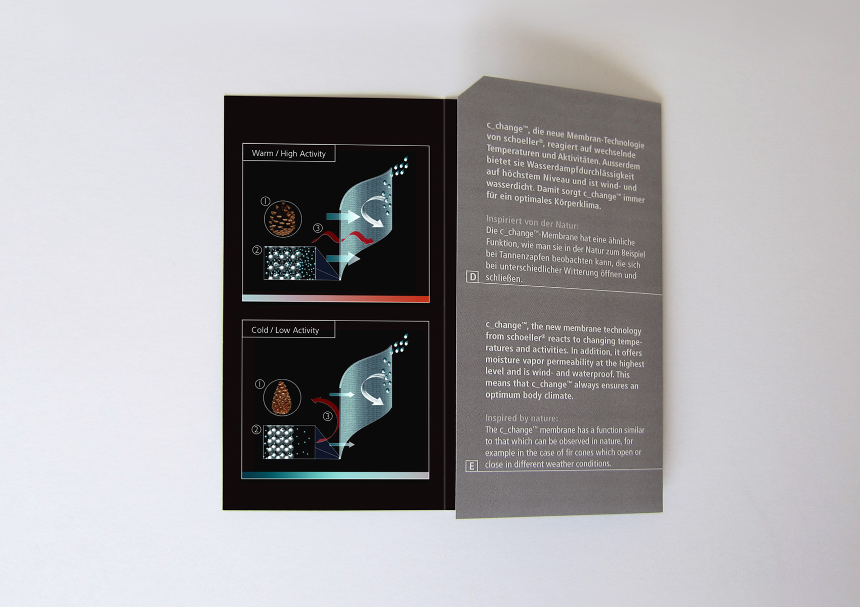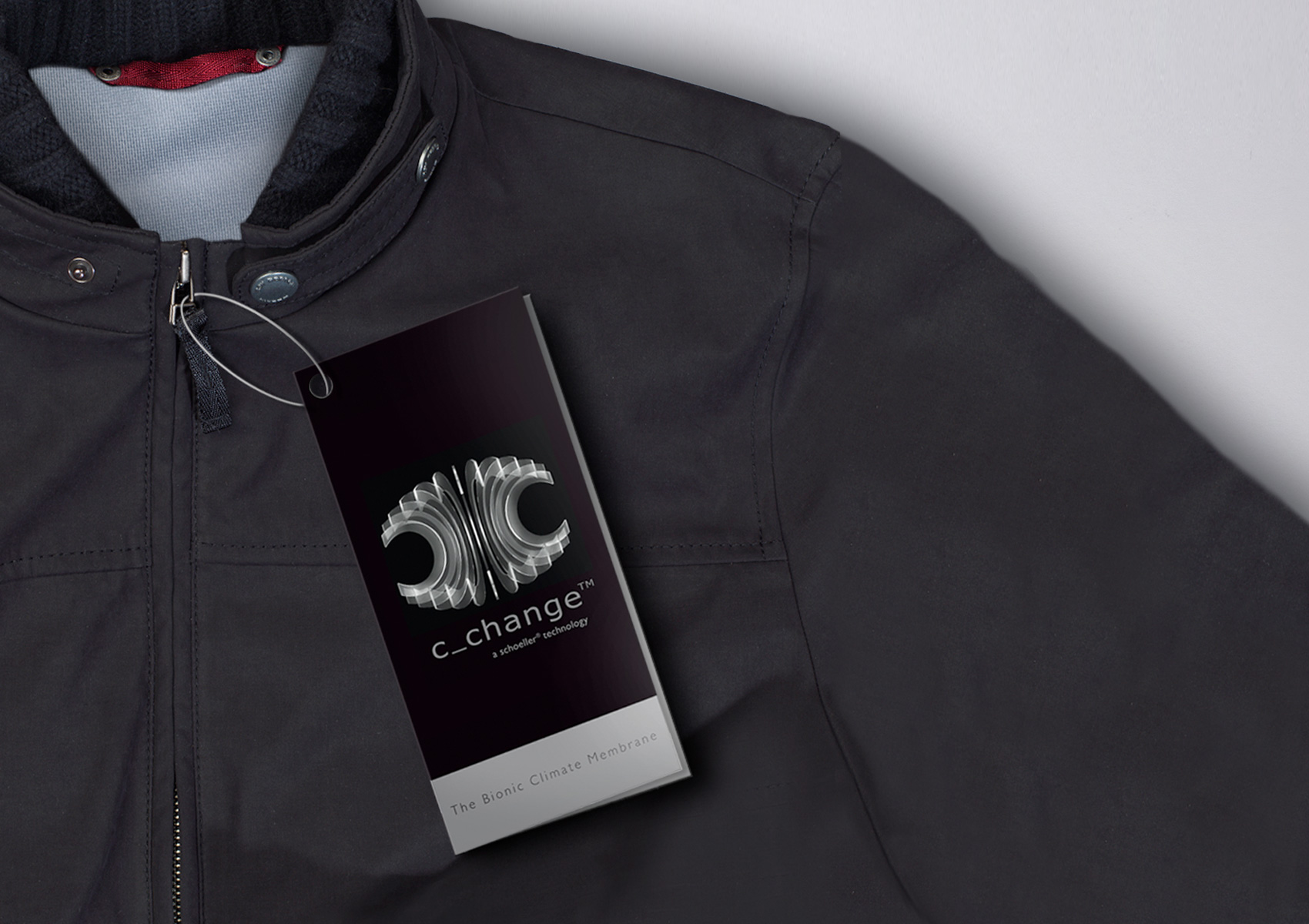 Die Arbeit für die Einführung von C_Change, einer Textilausrüstung von Schoeller, die aktiv auf klimatische Veränderungen reagiert, umfasste neben dem hier gezeigten Hang Tag auch die Entwicklung des C_Change Logos.